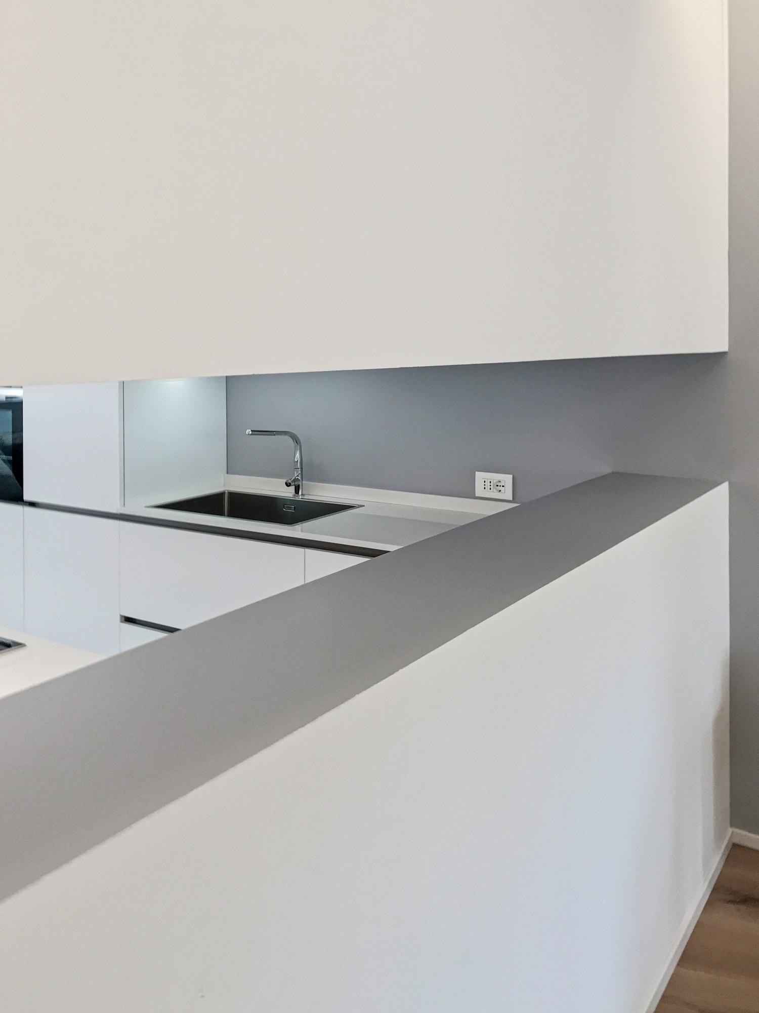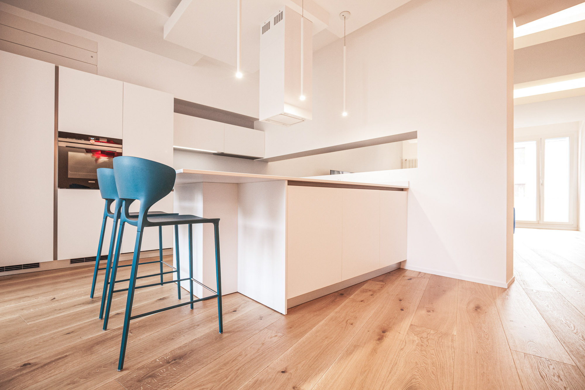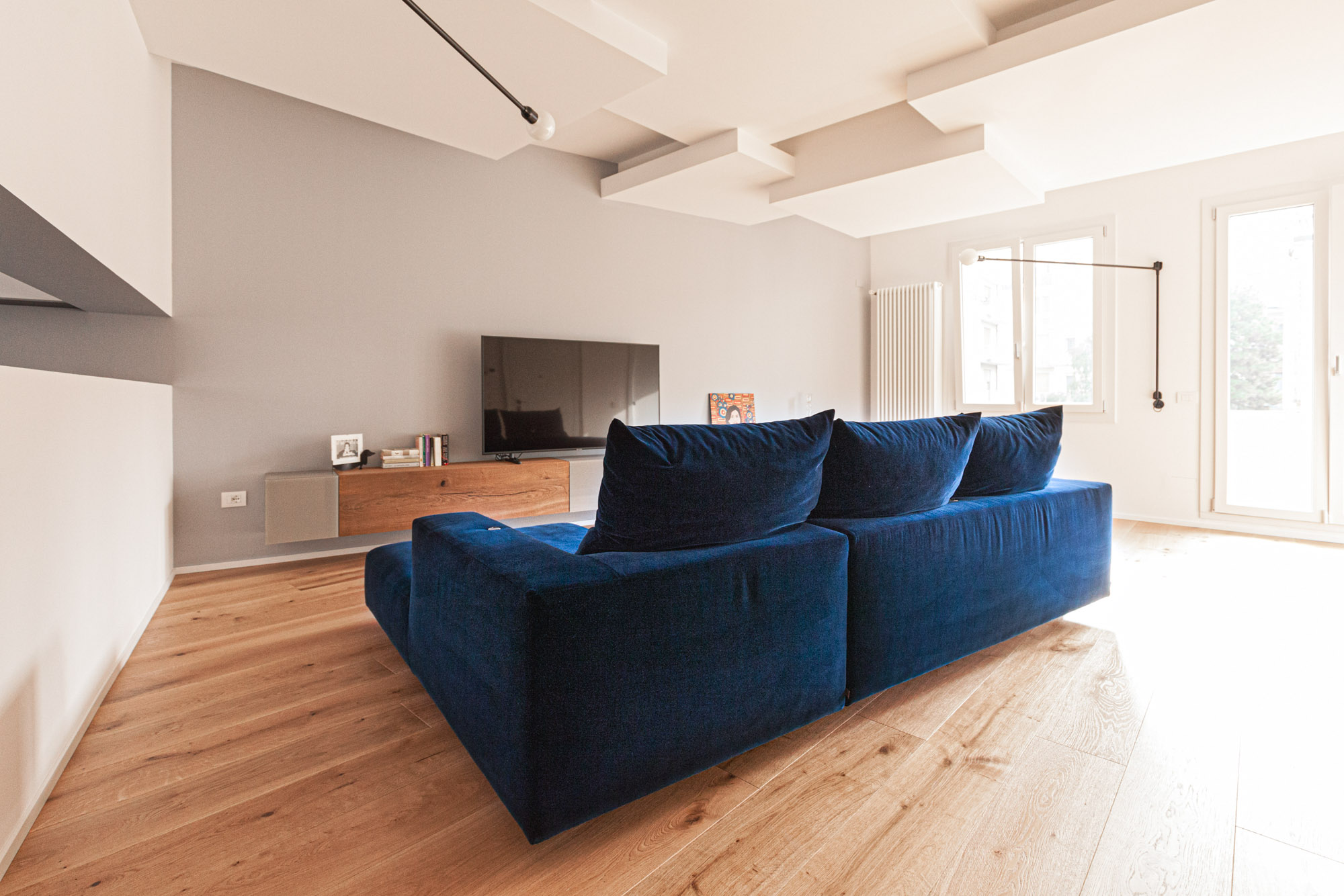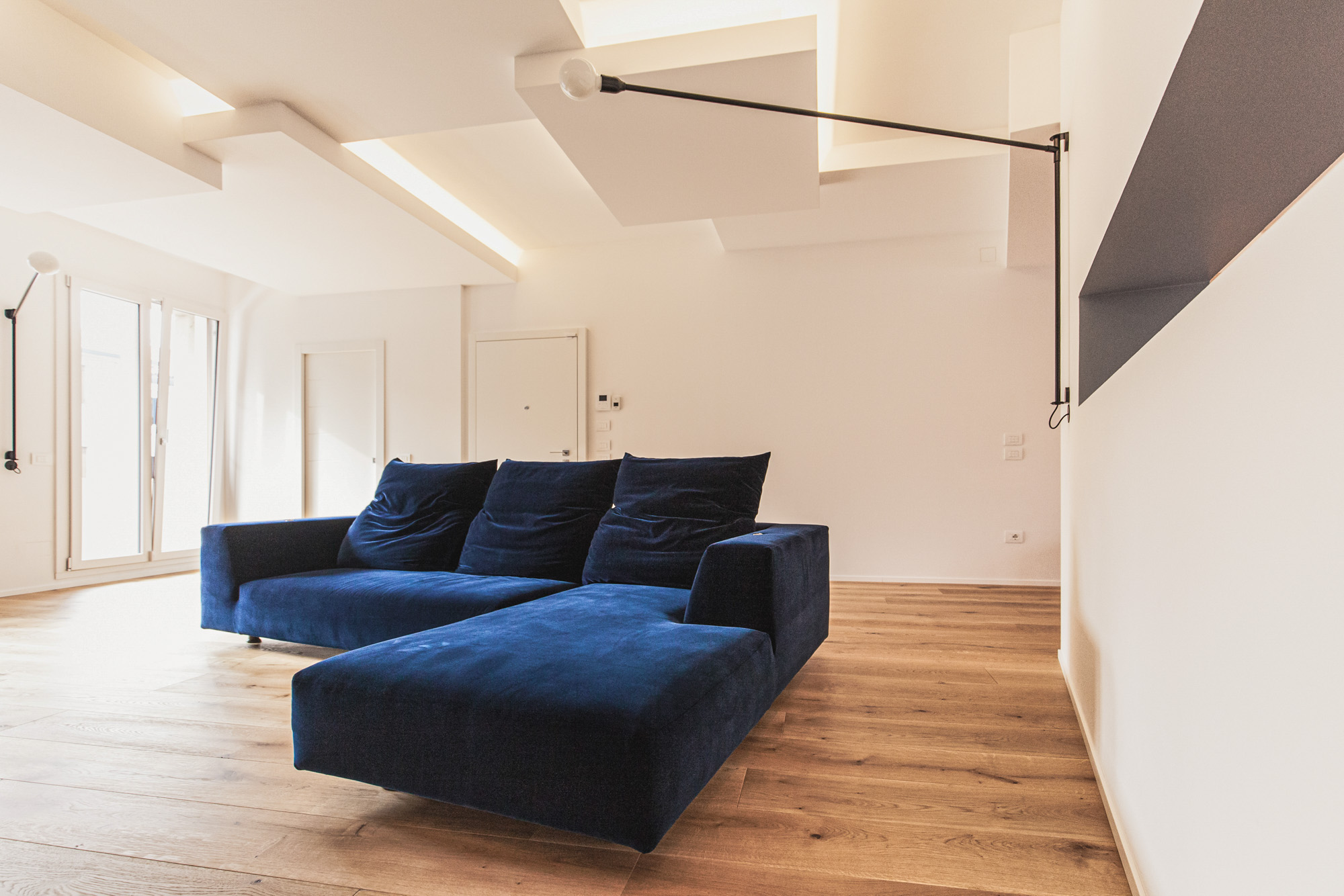 L’appartamento è un mix di originalità e classe, a cui si uniscono funzionalità e praticità d’uso quotidiano. È un progetto interessante per la ricerca accurata dei materiali, del colore e delle soluzioni architettoniche: il controsoffitto del soggiorno, è un’opera d’arte. Difatti, sfruttando l’altezza esistente, sono stati creati volumi contigui di diversa dimensione che hanno “felicemente confuso” la pianta assai irregolare dell’appartamento.