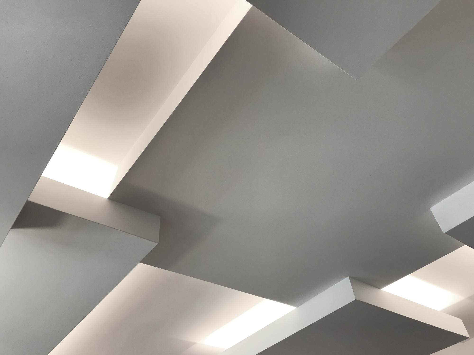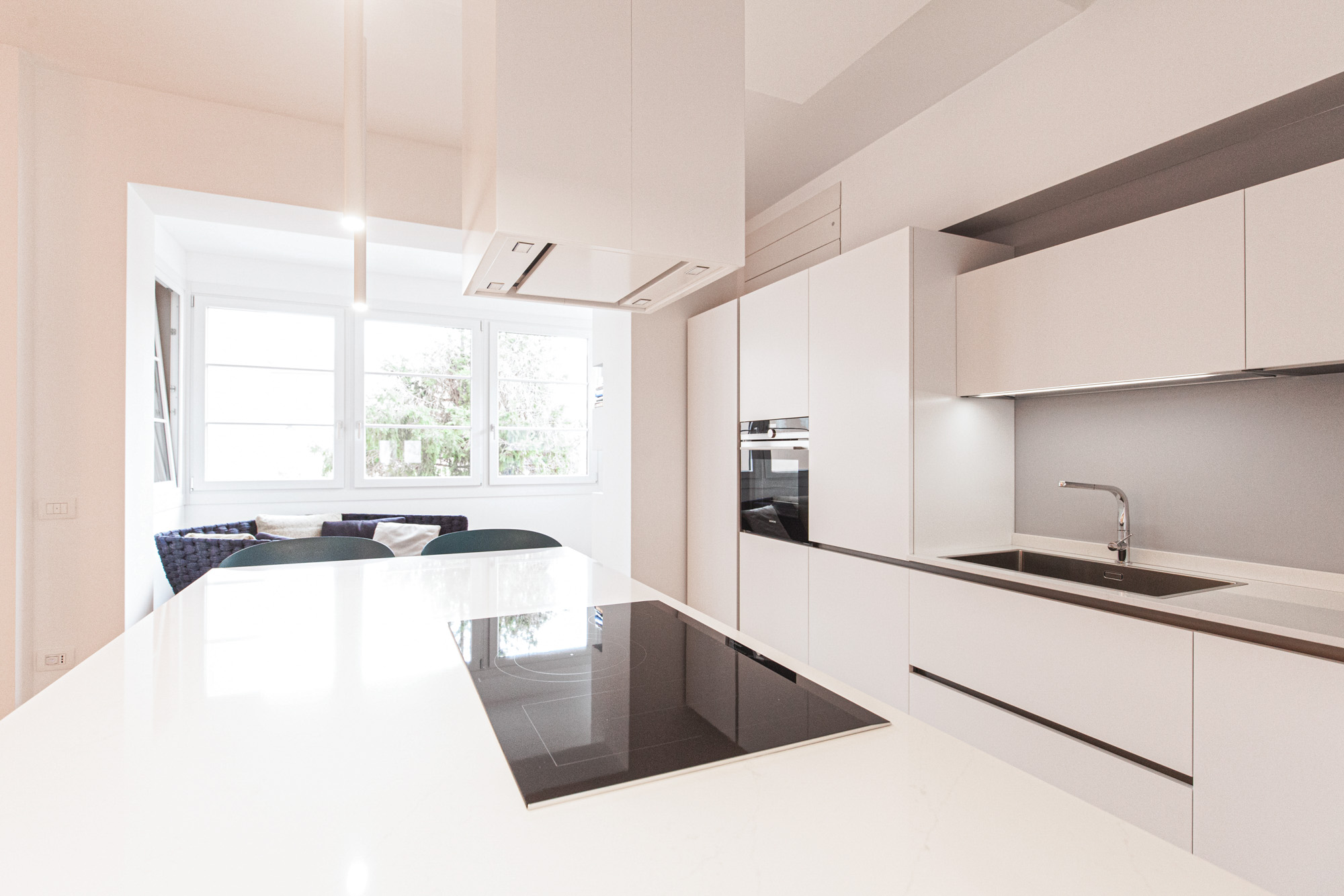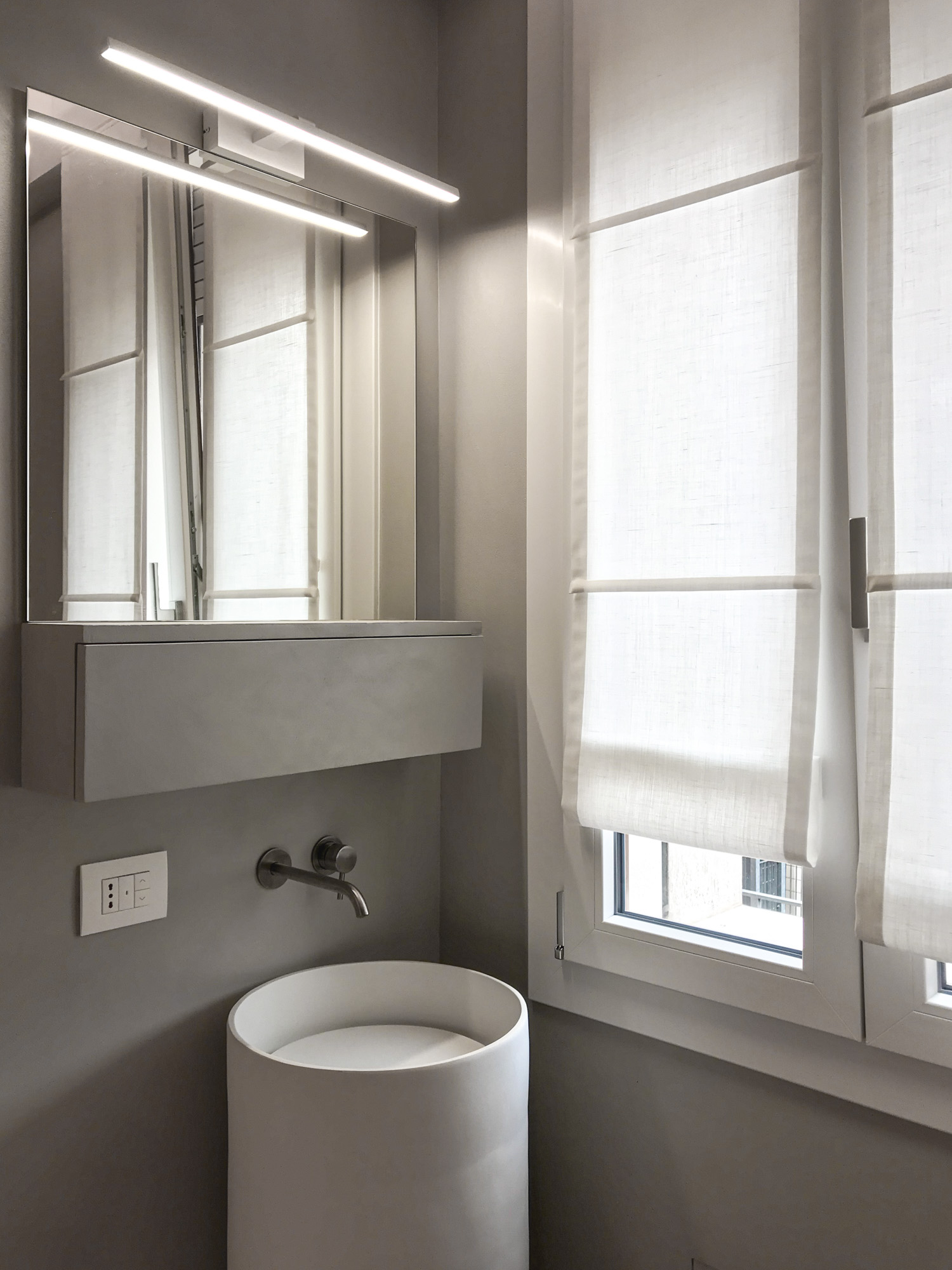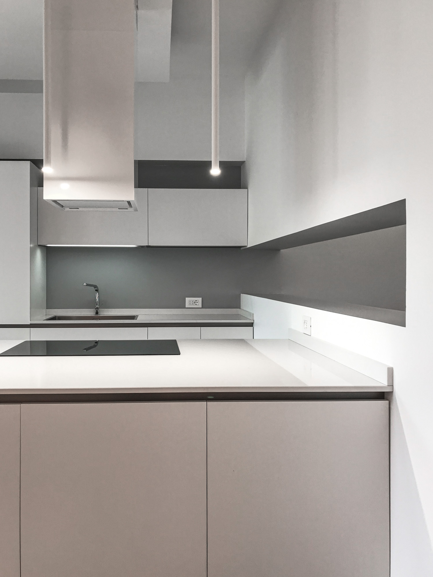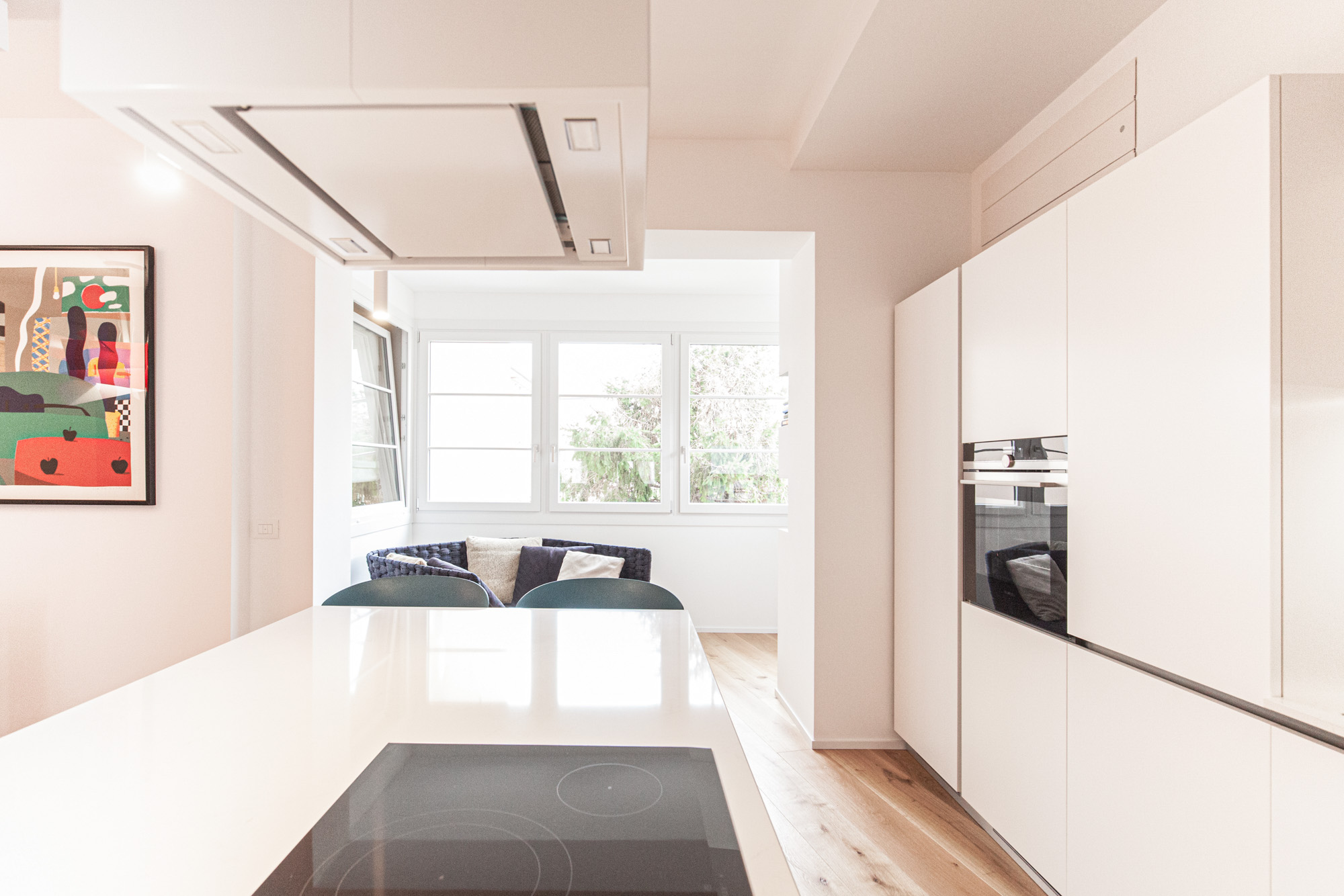 L’appartamento è un mix di originalità e classe, a cui si uniscono funzionalità e praticità d’uso quotidiano. È un progetto interessante per la ricerca accurata dei materiali, del colore e delle soluzioni architettoniche: il controsoffitto del soggiorno, è un’opera d’arte. Difatti, sfruttando l’altezza esistente, sono stati creati volumi contigui di diversa dimensione che hanno “felicemente confuso” la pianta assai irregolare dell’appartamento.